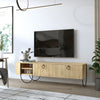 This TV stand is the perfect addition to any living room. With a width of 150cm, it can accommodate TVs up to 60" and provide a sturdy base for your entertainment system. The stand features 2 cabinets and 2 open compartments that offer ample storage space for all of your media essentials, such as DVD players, game consoles, and books.\nOne of the stand-out features of this TV stand is its unique design. The large metal oval legs add a modern and contemporary touch, while the vintage-style round handles add a touch of elegance. The combination of these two design elements creates a look that is both stylish and functional.\nThe TV stand is available in a variety of colors to match any decor. Whether you prefer a classic wood finish or a bold, modern color, this stand has something to suit everyone's taste. So whether you are watching your favorite movie or catching up on the latest series, this TV stand will make sure you have the perfect viewing experience.\nIn summary, this TV stand offers ample storage and a unique design, suitable for up to 60"TVs, with options of a different color to match your living room decor and enhance your viewing experience.