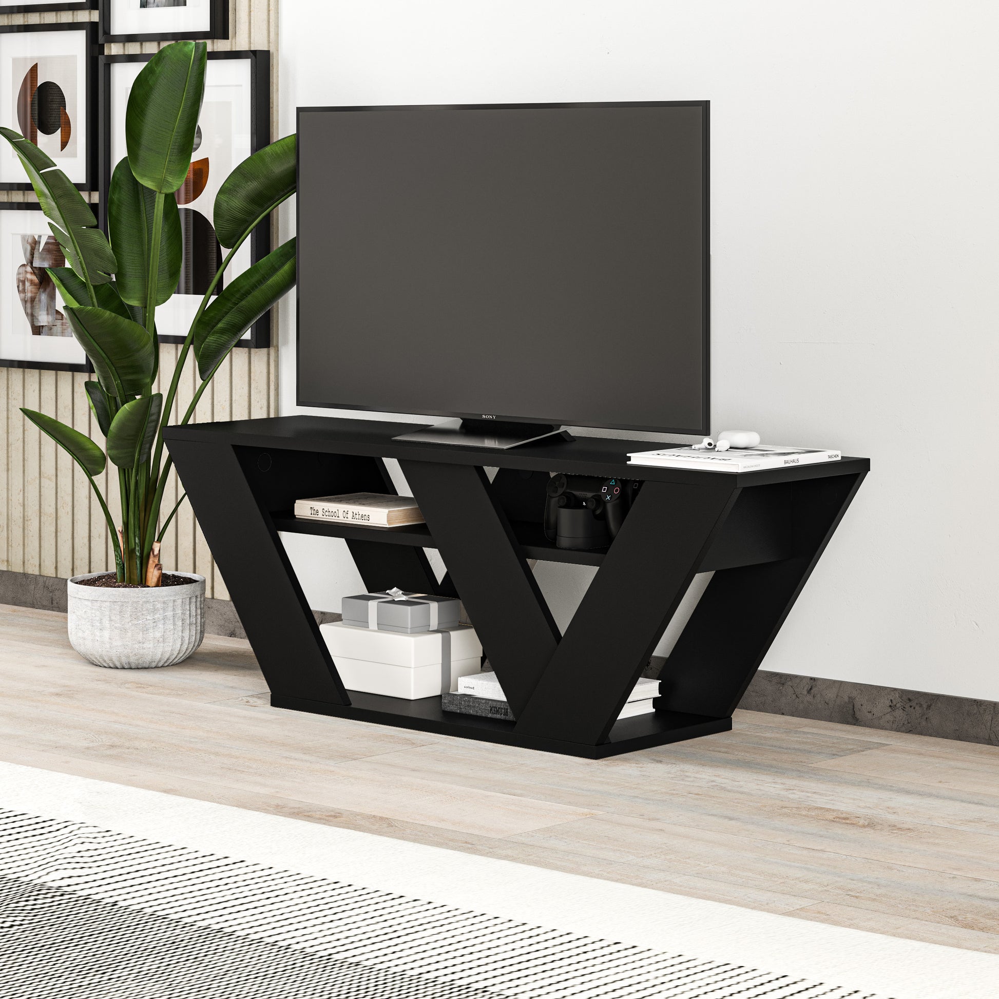 This stunning TV stand is the perfect addition to any living room or entertainment space. With its sleek, versatile design and unique v-shaped legs, it adds a modern and contemporary touch to any room. The TV stand is 110 cm wide, making it suitable for up to 43" TVs. It also features 2 open compartments that provide ample storage and organization for all your media and accessories. The TV stand is available in a variety of colors so you can find the perfect match for your space. This durable and sturdy TV stand is sure to be the centerpiece of your entertainment setup for years to come. Upgrade your living room or entertainment space with this stylish and functional TV stand.